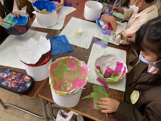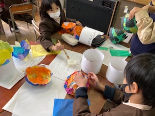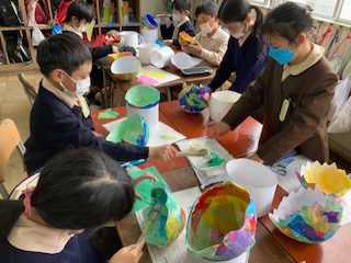 張り子で作ったカラフルなたまごを割り、中も紙を貼っています。たまごの中から飛び出してきたものは、一体なんでしょう?!楽しみです。