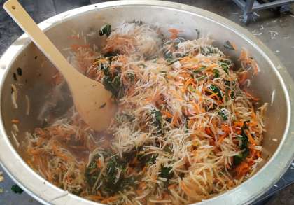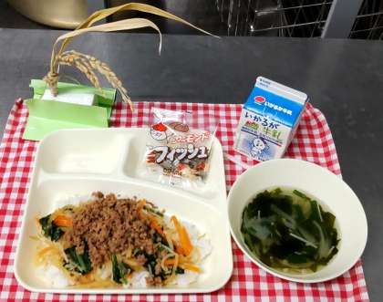 今日はビビンバ、わかめスープ、アーモンドフィッシュ、牛乳でした。ビビンバは本格的な味になるように肉と野菜を別々に調理して子ども達がご飯の上に盛りつけられるようにしました。とっても好評でした。
