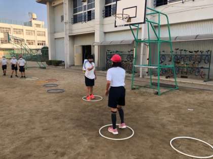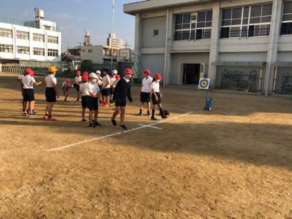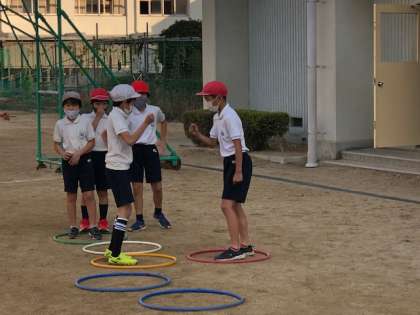 本校グラウンドで、体操とふえおにをした後、走りはばとびをしました。