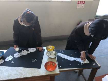 作品展に向けて、絵の具を綿につけて、ポンポンと押しながら汽車の型の上を色付けしました。