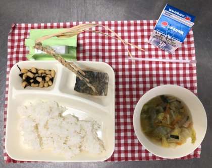今日はさごしのおろしじょうゆかけ、さといものすまし汁、大豆の煮もの、ご飯、牛乳でした。さごしは成長すると鰆(さわら)と呼ばれる出世魚です。