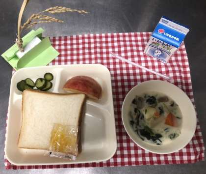 今日はきのこのクリームシチュー、きゅうりのバジル風味サラダ、りんご、食パン、マーマレード、牛乳でした。