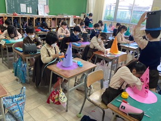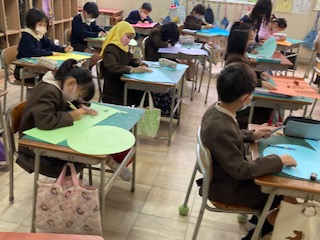 おしゃれな帽子を作っています。まず形を決め、それからカッターナイフで切り込みを入れたり飾りをつけたりして仕上げていきます。楽しみですね。