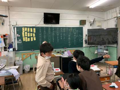 たくさんの熟語を例に出し、対になっている熟語や上の漢字が下の漢字の意味を消す熟語など、グルーブで話し合って分類しました。