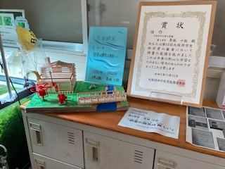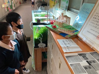 入賞した作品とレポート、表彰状を校長室前に掲示しています。下の学年の子ども達が