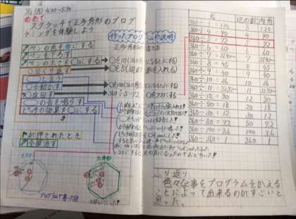 算数で現在学習している「正多角形と円」では、プログラミングについても学びます。予習としてプログラミングソフト「スクラッチ」を使って多角形をかく命令を出し、実行しました。