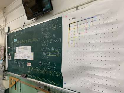 四角形のたてと横の長さの変化から気づいたことを話し合い、二つの数の関係性について考えました。