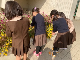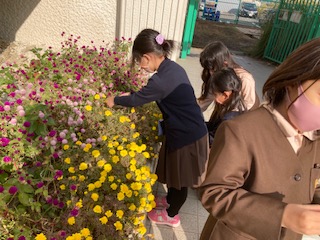 階段下のマリーゴールドの花柄つみを手伝ってくれました。枯れた花の中から種が見えるとびっくりしていました。家に持って帰って種を蒔くようです。
