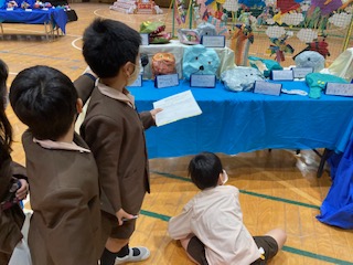 作品展を見学しました。友達の作品の素敵なところを見つけています。