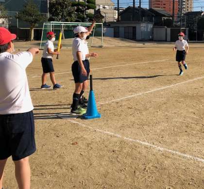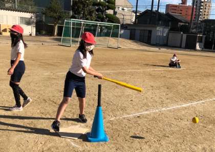 Tボールをしました。ルールを確かめ、チームで声をかけ合いながら楽しくゲームをしました。