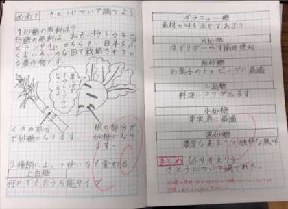 和菓子の歴史と砂糖との関わりについて国語で学習した際に配付した副読本を生かして、砂糖の原料や種類についてまとめました。