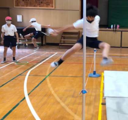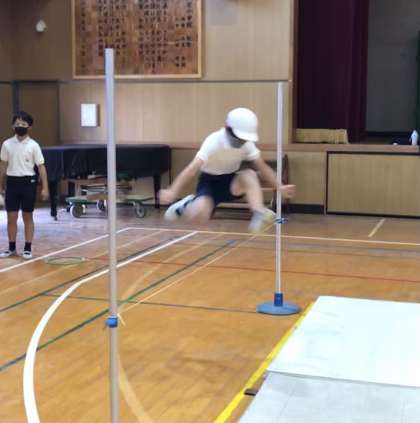 走り高跳びの学習に入りました。ジャンプなどの準備運動を取り入れながらフォームの確認をしました。