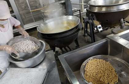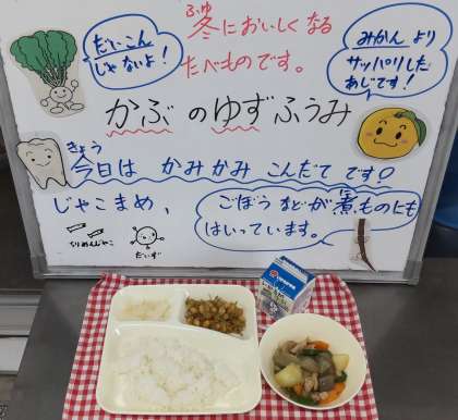 今日の給食は、鶏肉と野菜の煮もの、じゃこ豆、かぶのゆず風味、ご飯、牛乳でした。旬の蕪と柚子が登場しました。衣をつけて揚げた大豆とちりめんじゃこ、ごまを甘辛く煮詰めた人気メニューのじゃこ豆や煮ものに入った根菜はよく噛んで食べる力をつけるためのカミカミ献立です。