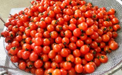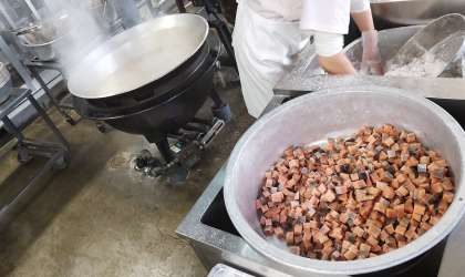 今日は、さけのマリネ、肉だんごと麦のスープ、プチトマト、コッペパン、ブルーベリージャム、牛乳でした。丁寧に衣をつけて揚げた鮭を薄切りの玉葱と甘酸っぱいマリネ液で絡ませました。プチトマトは約1900個のヘタを取りキレイに洗ってくれています。