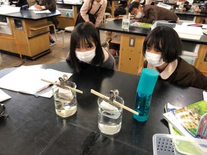食塩とコーヒーシュガーの水への溶け方について実験し、調べています。変化のようすを興味深げに見比べています。