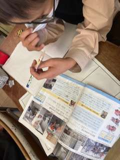 「消防署の仕事」をまとめています。国語科で学習した「要約」の方法を使っています。字数制限があるため、どこを削ったら良いか悩みながら書いています。