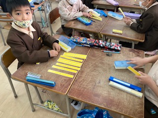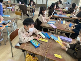二人組で、互いに数字を言い合って、その数だけブロックを出します。大きな数を言われたら、10のまとまりになつた紙のカードを出しています。