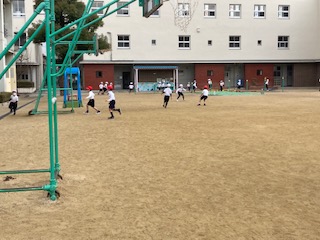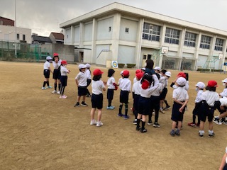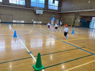走ったり、止まったりする運動を入れた遊びをしています。少し小雨もぱらついてきましたが、子どもたちはとても元気です。