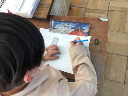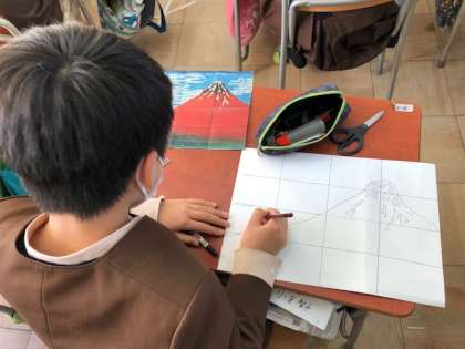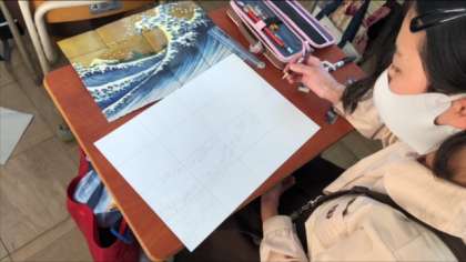 下がきにとりかかりました。縦横に線をひき、ブロックごとに丁寧に輪郭を描いていきます。