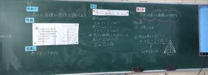 高さが2倍、3倍…になると面積も2倍、3倍…になるという比例の関係に気づくことができました。