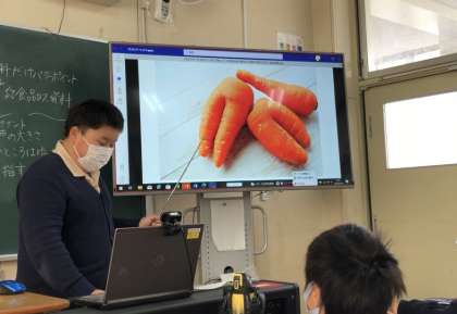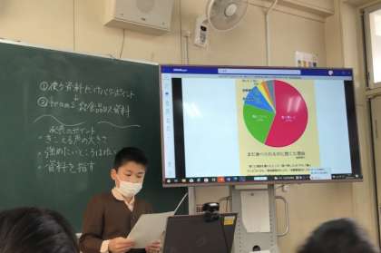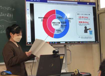 国語や総合的な学習の時間を使って、食品ロスについて調べ、自分の主張に沿ったグラフや写真などの資料を提示しながら発表しています。
