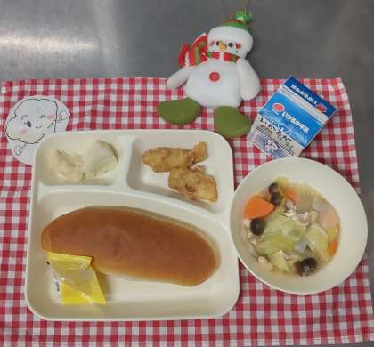 今日は、白身魚のフリッター、洋風煮、カリフラワーのサラダ、コッペパン、アプリコットジャム、牛乳でした。給食室で揚げたてのフリッターは大好評でした。