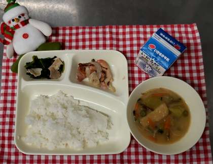 今日は鶏肉の柚子塩焼き、みそ汁、小松菜の煮びたし、ご飯、牛乳でした。小松菜は日本人が不足になりがちなカルシウムや鉄が豊富な旬の野菜です。