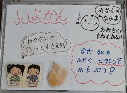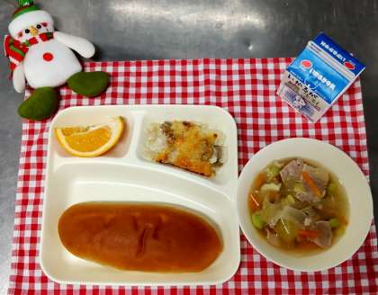 今日は、押し麦のグラタン、スープ、いよかん、黒糖パン、牛乳でした。給食のグラタンはルウから手作りです。野菜たっぷりのスープと冬が旬のいよかんとの組み合わせで好評でした。