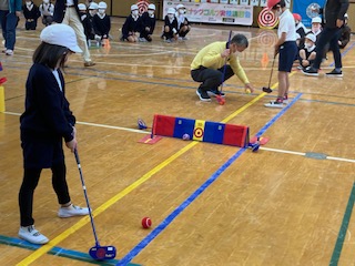 スナッグゴルフのゲームの最後に、上平先生は、子どもたちの代表一人と対戦してくださいました。