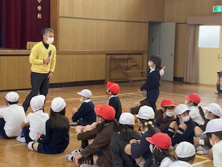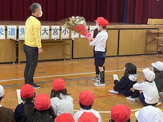 また、最後に質問コーナーも設けてくださり、「何才からゴルフわ始めたのですか?」の質問に、14才からと聞いた子どもたちは、より一層プロを身近に感じました。感謝の気持ちを込めて、お礼に花束を送りました。
