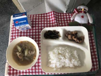 今日は、まぐろの甘辛焼き、豚汁、くきわかめの佃煮、ご飯、牛乳でした。