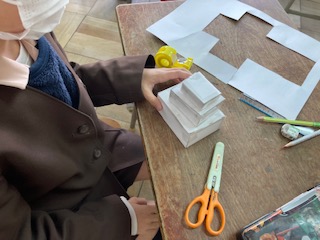 六つの面に切り分けて、どんな形から箱ができているか調べました。また、画用紙を長方形や正方形に切って、はりあわせて大きさの違う箱を作りました。