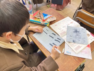 水書用筆を使って、点角に気をつけて漢字の練習をしました。とめ、はね、はらいの練習は、鉛筆で字を書くときに正しく美しく書くためのものです。