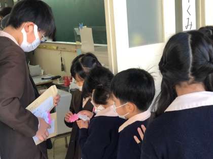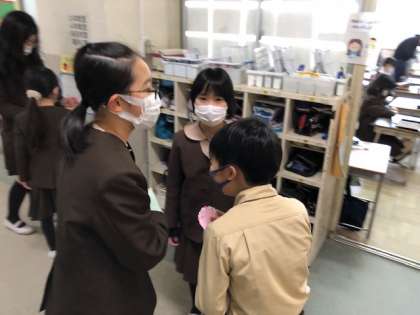 6年の卒業に向けて、ハッピータイム(たてわり班)の6年にプレゼントを渡します。そのメッセージカードの説明に下の学年の各学級をまわりました。