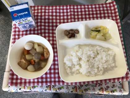 今日は、関東煮、白菜の甘酢づけ、トラ豆の煮物、ご飯、牛乳でした。関東煮は「おでん」とも呼ばれ、給食では小さなうずら卵を使っています。卵アレルギーにも対応した除去食も用意しました。