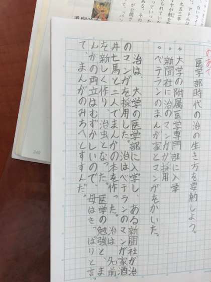 手塚治虫の伝記の医学部時代の章を読み、ノートに要約し、交流しました。