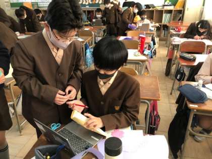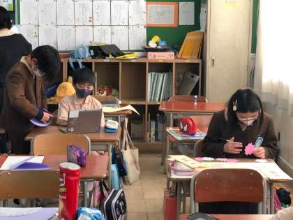 休み時間は、6年へのプレゼント作りをしたりストーブの周りで男女仲良く集まって話したりと楽しく仲良く生活しています。