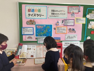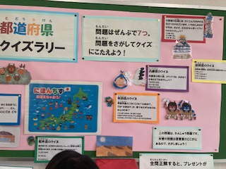 図書館の掲示板は、子どもたちが本の世界に誘われるようにいろいろな工夫がしてあります。「都道府県クイズラリー」もその一つです。全問正解すると、何かがもらえる?!
