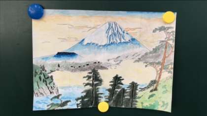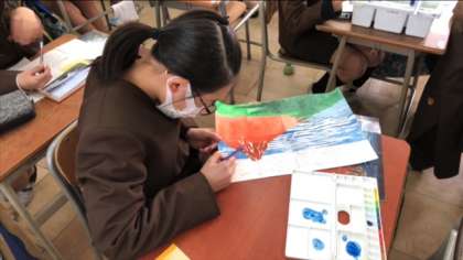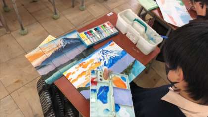 混色や薄め方、ぼかしなど表現を工夫しながら絵の具でていねいに仕上げます。