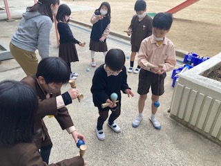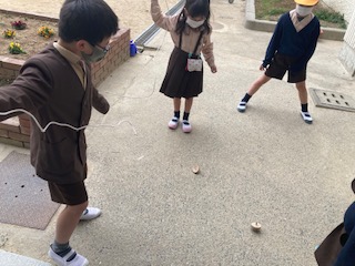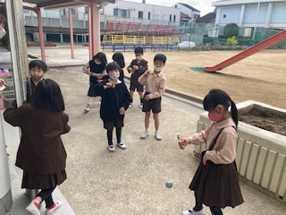 竹とんぼやこま、けん玉などの練習をしています。幼稚園、保育園の子どもたちに教えてあげる予定です。