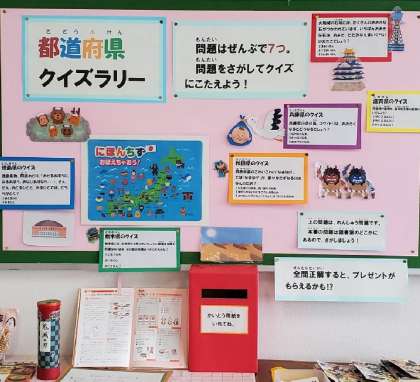 図書室の中の3月の掲示は、『都道府県クイズラリー』です。