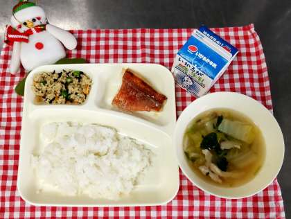 今日は、赤魚のレモン醤油かけ、うすくず汁、高野豆腐の炒り煮、ご飯、牛乳でした。粉末の高野豆腐とひじきを甘辛くご飯に合うおかずにしました。不足しがちなカルシウムと鉄がしっかり摂れます。