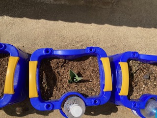 12月に植えたチューリップの芽が出始めました。花が咲く頃、みんなは2年生ですね。