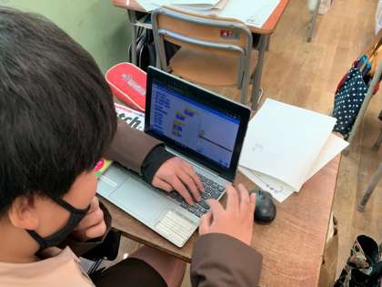 四年生では、プログラミングのソフトであるスクラッチが大流行しています。自分でいろいろ組み合わせて、ゲームのようなものまで作り上げていました。