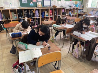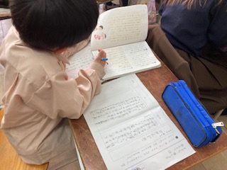 自分のお気に入りの場所について、なぜ気に入っているか、どんなことをするのかなど詳しく説明します。「はじめ」「中」「おわり」に分けて下書きを書き進めています。