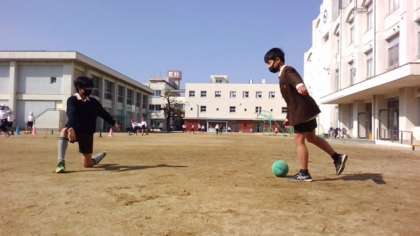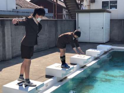 木版画で動く自分を表現します。小道具を使ったり場所を工夫したりして、自分たちで撮影しました。それを版画の題材にしていきます。