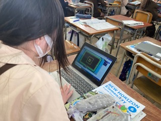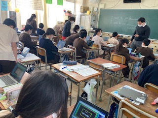 中学校に入学したら、何クラブに入りたいか英語で話しました。その後、PCアプリを使って、出てきた絵を見て、何の職業か答える英語ゲームをしました。