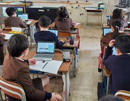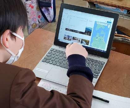 一人一台端末で、日本各地の有名な所を調べて、まとめていきます。社会科の都道府県の学習にもつながっています。