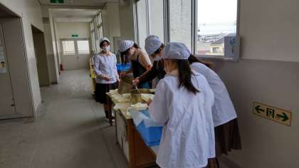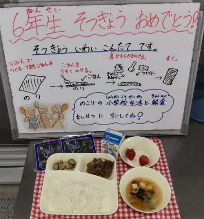 今日は6年生の卒業をお祝いする献立でした。自分で巻く手巻きご飯の具には、牛肉の甘辛煮とツナソテーを用意しました。これに、すまし汁といちごを組み合わせています。残りわずかとなった小学校生活と給食、楽しんでくださいね。
