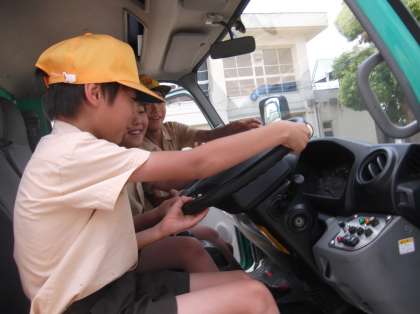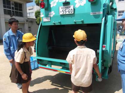 6/1に城北環境事業局からパッカー車が来て、実際にごみをパッカー車につめこむ体験をしました。アルミ缶とスチール缶の重さの違いを持ち上げてみて実感したり、パッカー車の運転席にも座らせてもらったりもしました。